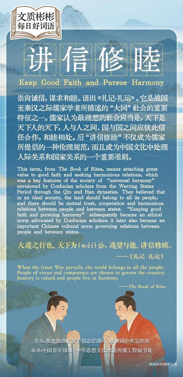 This term, from The Book of Rites, means attaching great value to good faith and seeking harmonious relations, which was one of the key features of the society of "universal harmony" envisioned by Confucian scholars from the Warring States Period through the Qin and Han Dynasties. They believed that in an ideal society, the land should belong to all its people, and there should be mutual trust, cooperation and harmonious relations between people and between states. "Keeping good faith and pursuing harmony" subsequently became an ethical norm advocated by Confucian scholars; it later also became an important Chinese cultural norm governing relations between people and between states.